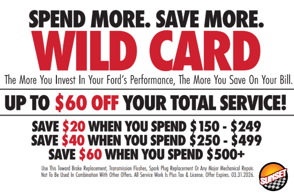 Valid at Sunset Ford only. Valid for Ford vehicles only. Void where prohibited by law. Taxes not included in price. Coupon has no cash value. Environmental disposal fees may apply. Not to be combined with any other offers, Coupons, or prior discounts. Must present coupon in person at the time of arrival. Limit one coupon per customer per service item to receive these savings. Expires 03/31/26