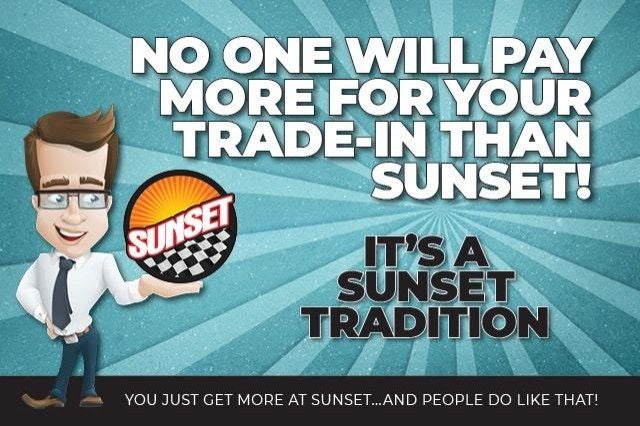 “MSRP” is an acronym for Manufacturer’s Suggested Retail Price. This is required for all manufacturers to provide. MSRP is not an offer to sell at that price. It is the “Manufacturer’s Suggested Retail Price” before extras. “MSRP” will be exactly the same for any new vehicle with the exact same make, model, model year, equipment, and options at every franchise dealership in the United States. No dealer has a competitive advantage over another with MSRP. ‘Dealership price’ or ‘sale price’, when shown, reflects the sale price of the vehicle, including all applicable rebates and discounts unless expressly shown differently. Accessories & dealer-installed modifications are included in the “Dealership Price”. ‘Dealership price’ or ‘sale price’ does not include tax, title, government fees, a negotiable $200 document processing fee, license, vehicle registration or any financing fees. Contact us for details on any applicable fees or taxes that may apply to your specific situation. Sunset will always provide you with a clear and transparent summary of the final sale price and all applicable fees and taxes. All vehicles are “one only” and are identified by VIN and/or stock number. Some manufacturer discounts, rebates, incentives, and special financing cannot be combined or stacked. Not all customers qualify for all available manufacturer discounts, rebates, incentives, and special financing. Contact the dealership to verify which manufacturer discounts, rebates, incentives, and special financing you qualify for. Sunset will work to ensure that you will receive all applicable manufacturer incentives. All prices, specifications, and availability subject to change without notice. Contact dealer for most current information. While we make every reasonable effort to ensure the accuracy of the information displayed on this website, some prices may not include dealer installed added options, some features and options listed may not apply to this Sunset Vehicle. Please verify any information in question with a dealership sales representative prior to any negotiations. Customers should verify the existence and condition of any equipment listed. EPA Estimates Only. Your actual MPG may vary based on your driving characteristics. All offers expire on close of business the day subject content is removed from website, and all financing is subject to credit approval. All transactions are negotiable including price, trade allowance, interest rate (of which the dealer may retain a portion), term, and documentary service fee. Any agreement is subject to execution of contract documents. Warranty Protection for Life™ is included on all qualifying new and pre-owned vehicles. Some restrictions may apply. Contact the dealership for details on your vehicle of interest. This warranty is honored at any ASE certified repair facility in The United States and Canada. Note: There is now a modest $200 deducible per claim. Manufacturer maintenance requirements and records are mandatory. Contact dealer for complete details. There are some vehicles that are not eligible for this coverage. A complete list of ineligible vehicles is available upon request. Warranty Protection for Life is not included on vehicles purchased by a business entity or used for Commercial & Fleet purposes. Owners are responsible for maintaining their vehicle according to the original manufacturer’s recommendations. Failure to do so or keep records may void your warranty. Aftermarket vehicle modifications may void your warranty. Contact dealer or review your warranty agreement for details on maintaining this coverage. Sunset’s Oil Changes for Life is included on all qualifying new and pre-owned vehicles. Some restrictions may apply. Contact the dealership for details on your vehicle of interest. See dealer for complete details. There are some vehicles that are not eligible for this coverage. A complete list of ineligible vehicles is available upon request. Verify prior to purchase if a vehicle comes with either Warranty Protection for Life or Oil Changes for Life. Although every reasonable effort has been made to ensure the accuracy of the information contained on this site, absolute accuracy cannot be guaranteed. This site, and all information and materials appearing on it, are presented to the user "as is" without warranty of any kind, either express or implied. All vehicles are subject to prior sale. Price does not include applicable tax, title, and license charges. ‡Vehicles shown at different locations are not currently in our inventory (Not in Stock) but can be made available to you at our location within a reasonable date from the time of your request, not to exceed one week. If you have any questions about or would like clarification on any information found on this website, please contact us. The Manufacturer’s Suggested Retail Price excludes tax, title, license, dealer fees and optional equipment. Dealer sets final price.